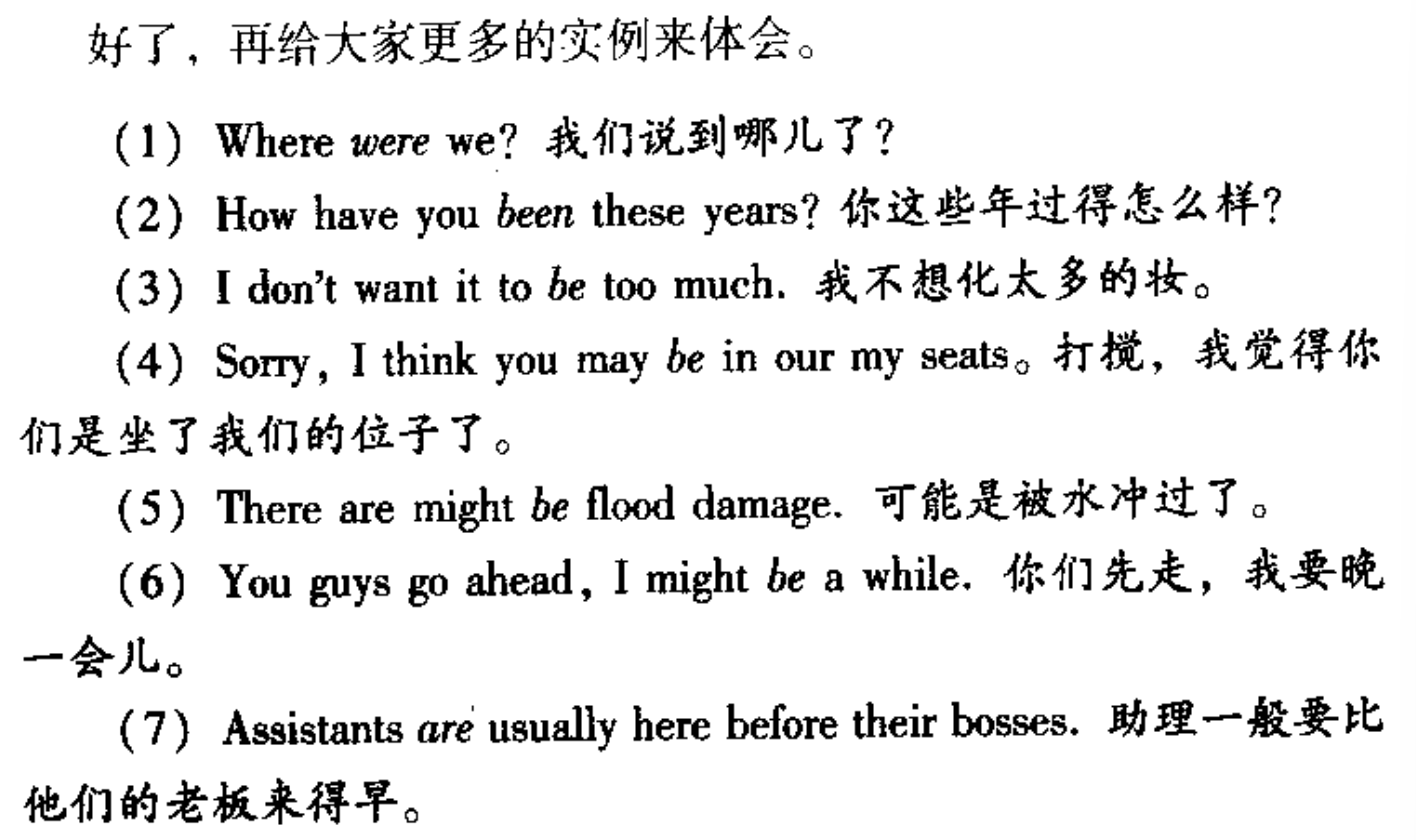 昨天提到的be的特点,可以帮助我们切换频道,作者说的是:当汉语种的句子需要用一个甚至几个动词来表达的时候,可以先考虑是否能用一种状态、一种性质的判断来代替。