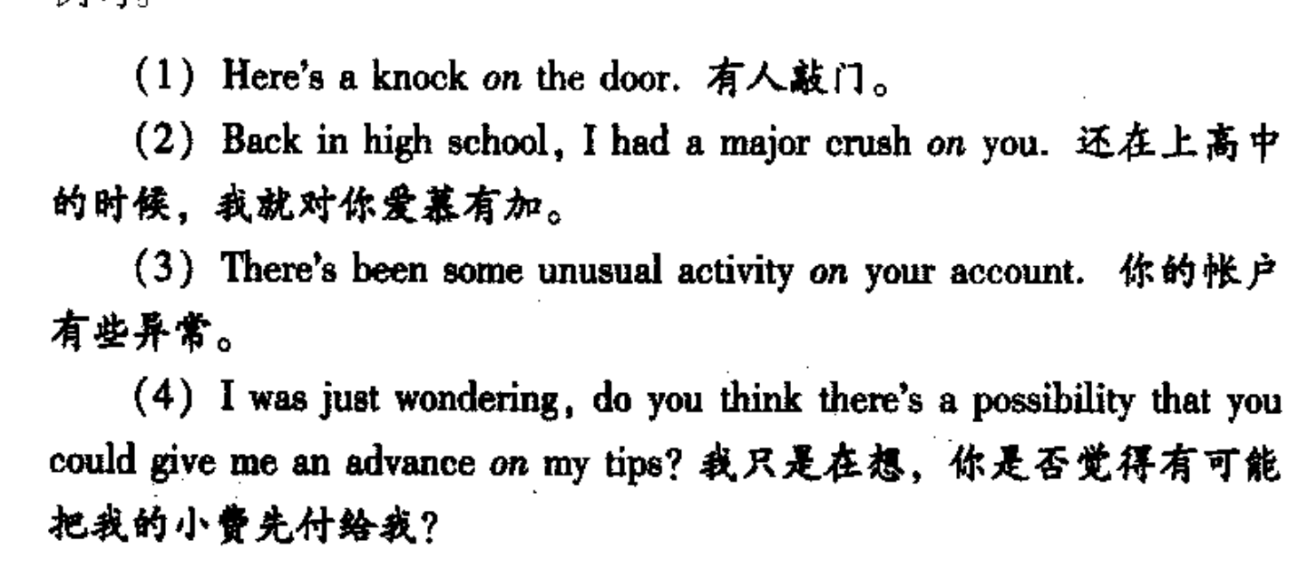 第37页 本节介绍的on 的用法,更是神奇,更是看着一楞楞的,check on my grandma. 这种标识方法,在我们看来,就是检查祖母,但是,人家的实际意思是:看看祖母怎么样了。